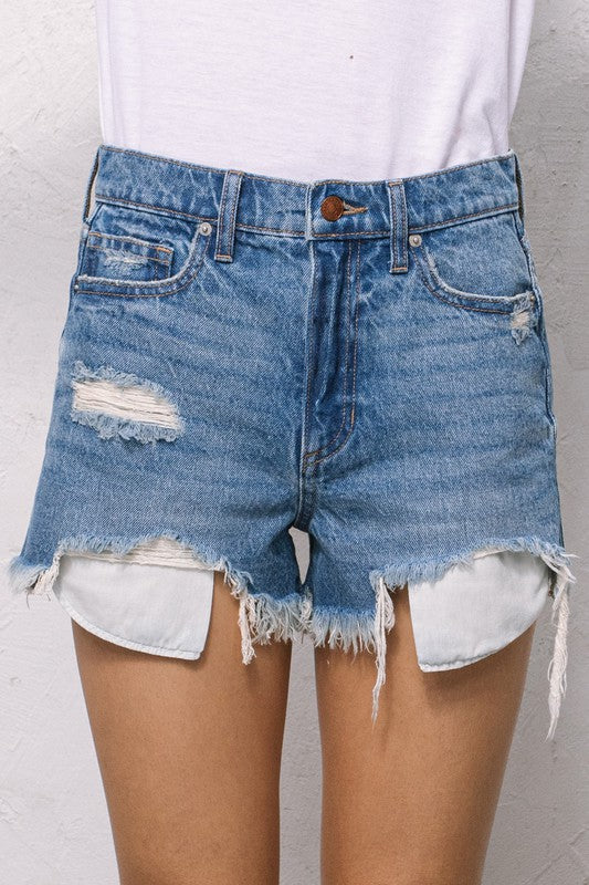 High rise 90'S SHORTS WITH DISTRESSING, FRAYED HEM AND POCKETS