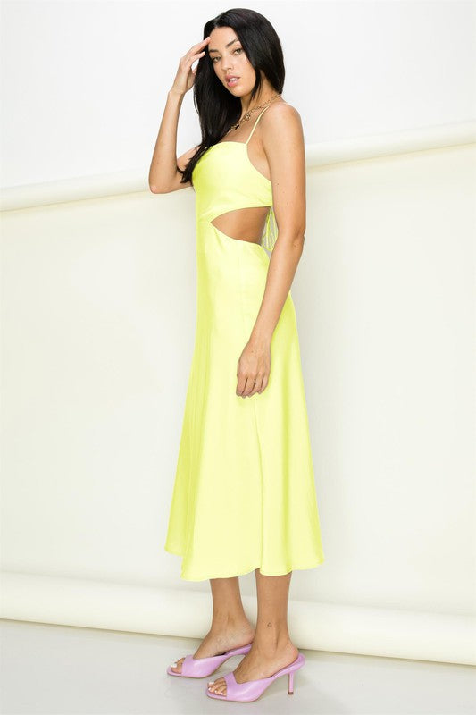Get Glammed COWL NECK MIDI DRESS WILL HAVE EVERYONE COMING FOR YOUR LOVE! FEATURING A DRAPED COWL NECKLINE, IT COMES WITH CRISSCROSS SPAGHETTI STRAPS THAT LACE DOWN THE BACK AND TIE AT THE WAIST. SEXY SIDE CUTOUT DETAILING INCLUDED.