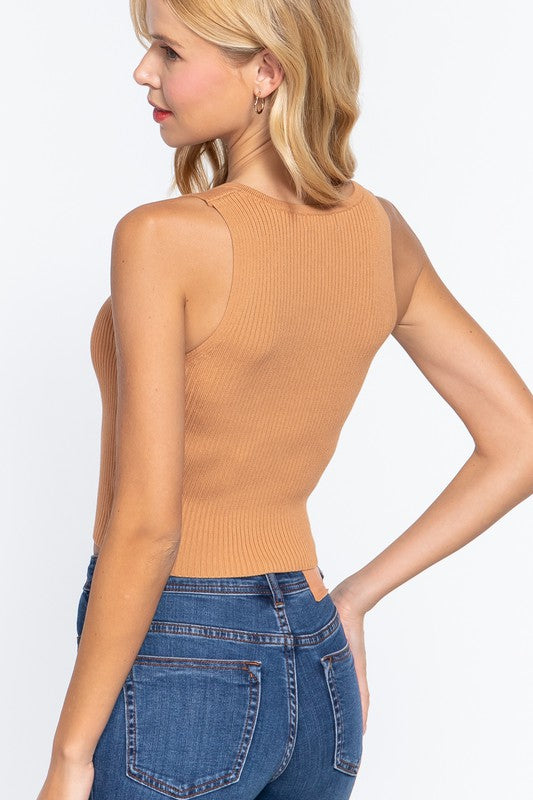 Sleeveless ROUND NECK WITH SNAP BUTTON DETAIL CROP SWEATER TOP