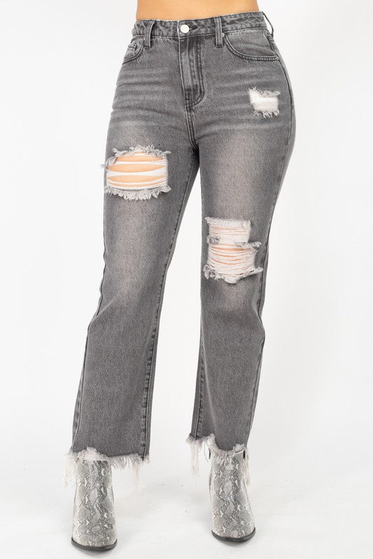 A knit pair of straight-fit denim jeans featuring a ripped detail, high waist, belt loops, traditional five-pocket construction, Capri-length, and a distressed hem.Fabric71% Cotton, 27% Polyester, 2% Viscos