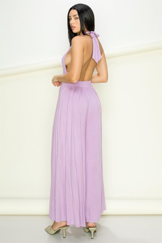 THE JUMPSUIT FEATURES A HALTER V-NECK WITH STRAPS THAT CAN BE TIED AT