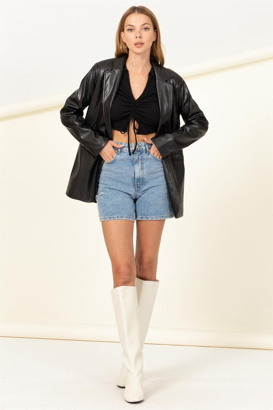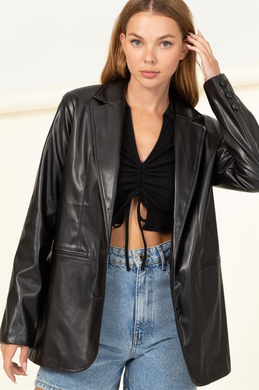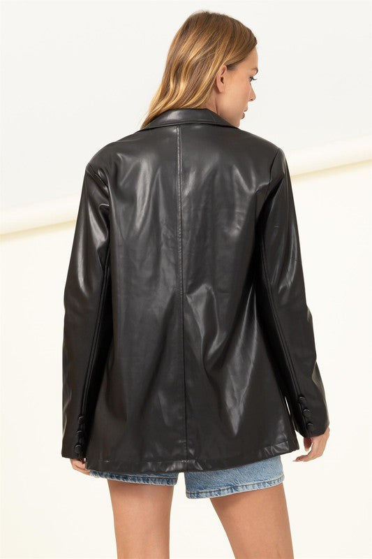 Feel like a CONFIDENT QUEEN ON YOUR NEXT FUN TIME OUT! COMPOSED OF PU, THIS BLAZER FEATURES A NOTCHED COLLARED NECKLINE AND LONG SLEEVES. THE OVERSIZED BODICE HAS TWIN WELT POCKETS AND TWO BUTTON CLOSURES AT FRONT.